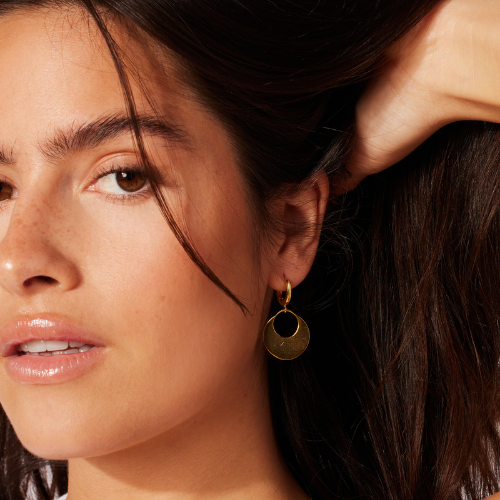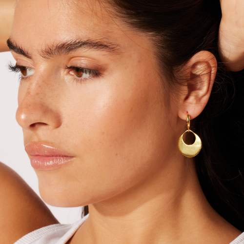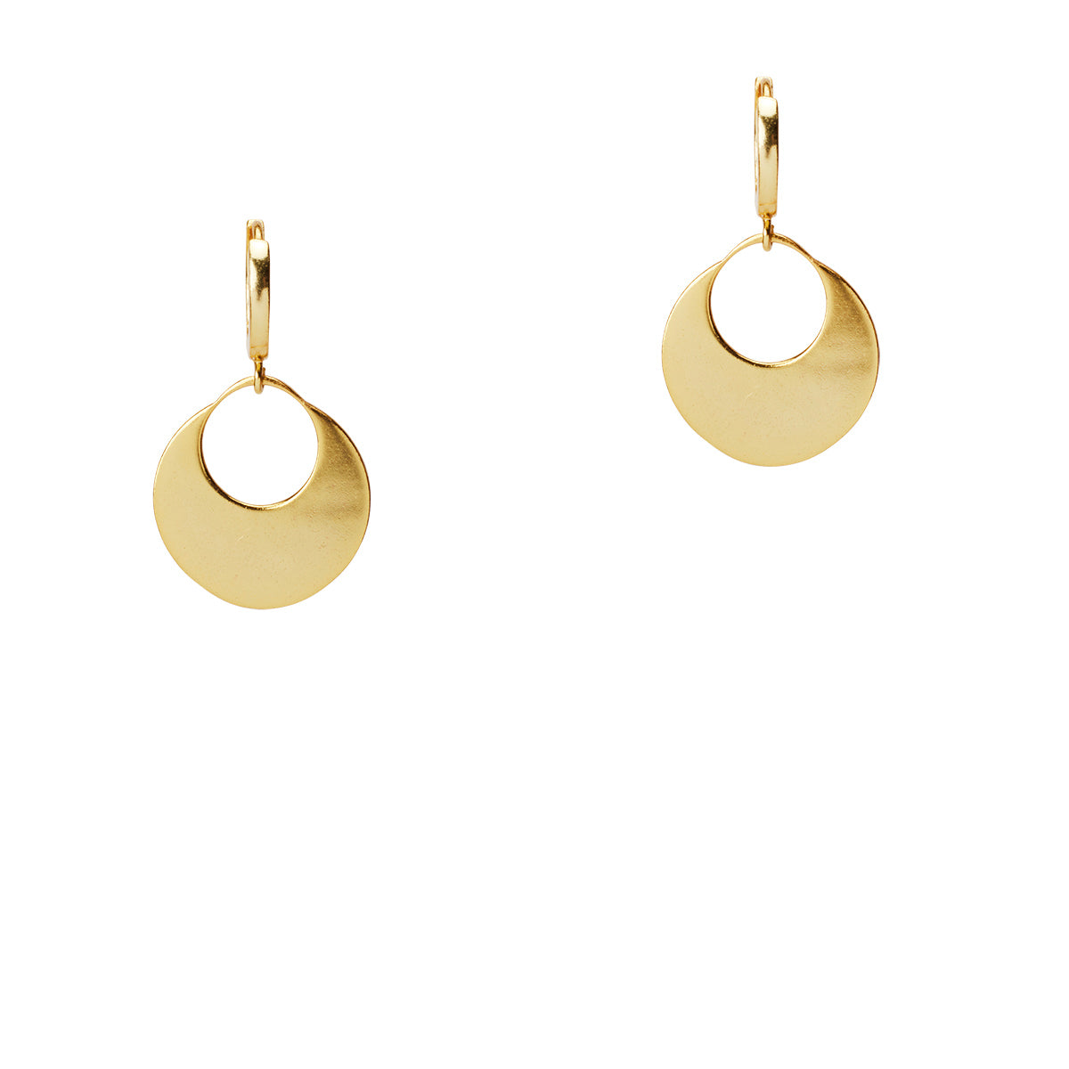 Saca tu lado divertido con estos aretes colgantes circulares con un acabado dorado brillante. ¡Excelente para cubrir tu lóbulo!