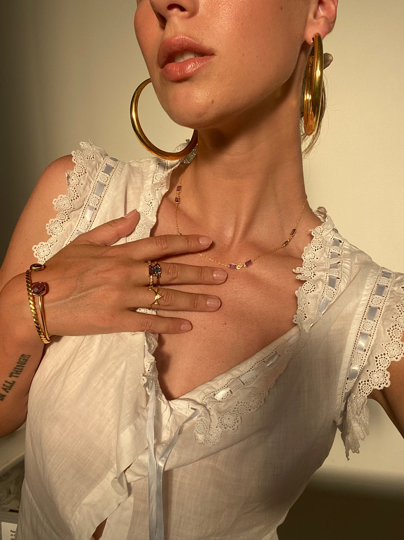 Our demi-fine pieces are designed for everyday wear. To keep your jewelry glowing, avoid chemicals and store dry.