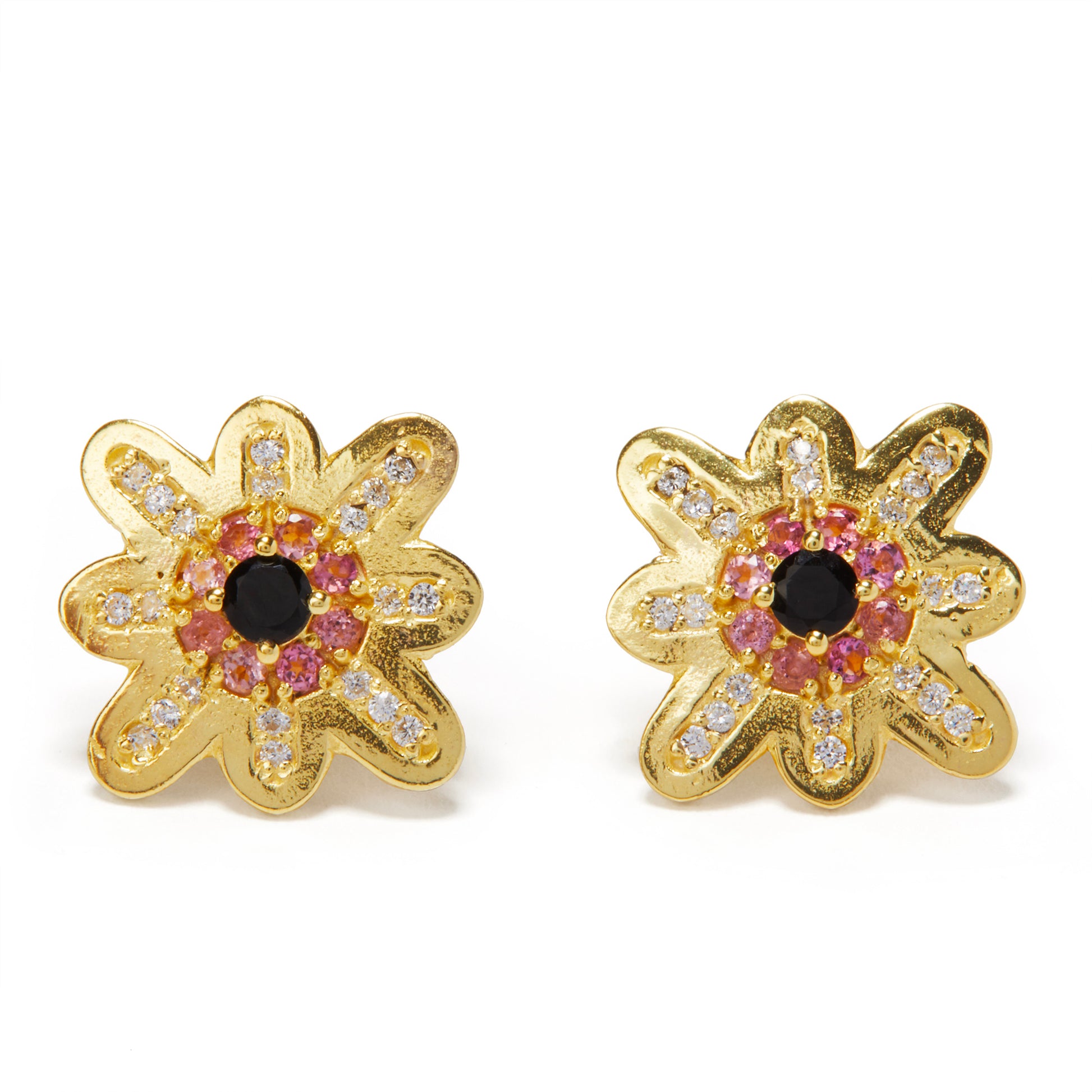 The earrings showcase genuine black chalcedony and pink tourmaline stones, elegantly set in 18k gold-plated 925 Sterling silver, measuring 1/2" long by 1/8" wide, designed for pierced ears with a secure post back.